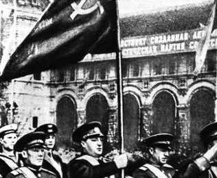 Герой Советского Союза К. Я. Самсонов на одном из парадов на Красной площади со Знаменем Победы, которое было водружено на здании рейхстага