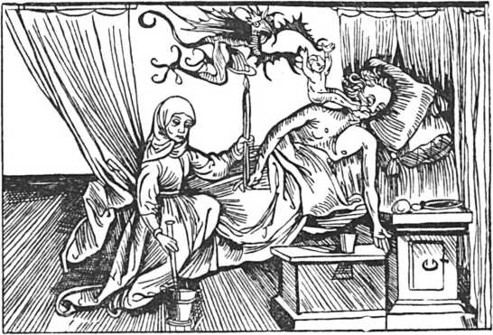Выдумка религии, что душа умершего покидает тело (старинный рисунок). В глубокой древности люди, не имея понятия о строении своего тела и не умея правильно объяснить сновидения, создали ложное представление о том, что их мышление и ощущения зависят от души, находящейся в теле, пока человек живет, и покидающей его, когда человек умирает. Религия внушает, что все болезни "божье наказание" за грехи или "испытание" покорности человека "волье божьей". Церковь утверждает, что больному помогают ни лекарства и врачи, а молитва и вера, и что существуют "святые" специалисты по лечению различных болезней, к которым и нужно обращаться с молитвами.