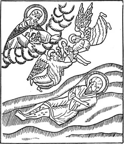 Религиозные выдумки о душе умершего: ангелы уносят душу на небо (лубок, изображающий евангельскую причту об убогом Лазаре, вознагражденном богом после смерти за смирение и покорность при жизни).