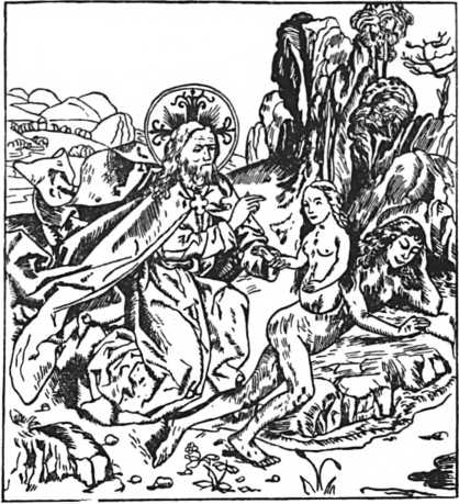 Выдумка религии о сотворении богом первых людей (старинный рисунок). Библия содержит антинаучные вымыслы о том, что бог сотворил первого человека из праха земного по образу и подобию своему, вдохнул в него душу и назвал Адамом. Из ребра же Адама была якобы сотворена первая женщина – Ева.