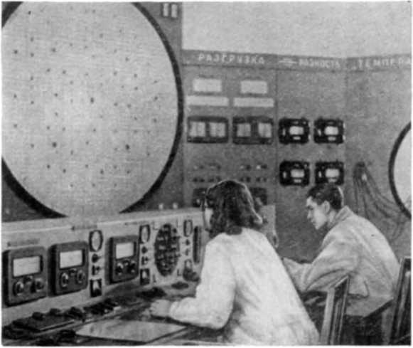 У пульта управления советской атомной электростанцией. Так люди, как показывают факты, способны без помощи божественных сил не только познавать тайны ядерных энергетических процессов в природе, но и ставить себе на службу все более могучие природные силы.