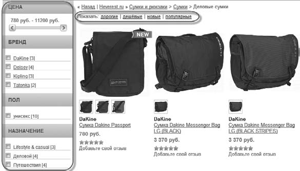 Кроме дополнительных вспомогательных меню в интернет-магазинах весьма полезны специальные фильтры, которые позволяют клиентам быстро выбирать подходящие товары в соответствии с заданными критериями или параметрами, например по цвету, весу и т. д. (рис. 41).