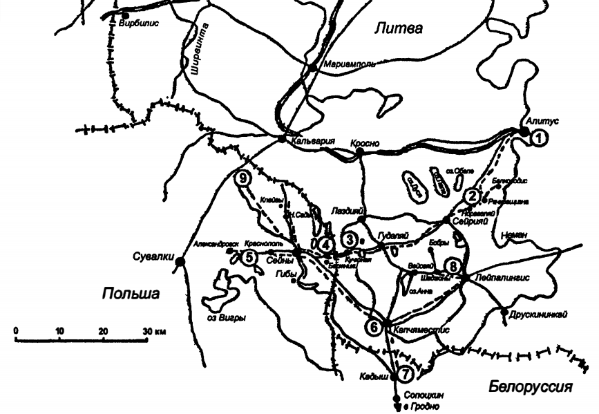 Записки кавалериста. Схема III (к главам VII–XI). 1. Олита, куда прибыла дивизия после переброски из Польши (начало главы VII). 2. Расположение Уланского полка в Рачковщизне и ведение разведки на Серее (глава VII). 3. Наступление через Серее, Гуделе и ночное столкновение с немцами за Коцюнами у Голны-Вольмеры (глава VIII). 4. Дальнейшее наступление, бой в районе Бержников (глава IX). 5. Третий день наступления, разведка и бои в районе Краснополя (начало главы X). 6. Отход от Сейн на Копциово (середина главы X). 7. Бивак в Кадыше (конец главы X). 8. Расположение улан в Лейпунах и дальний разъезд с Чичаговым на Шадзюны – Бобры (начало главы XI). 9. Наступление на дорогу Сувалки – Кальвария, эвакуация через Ковно в Петроград на лечение (конец главы XI).