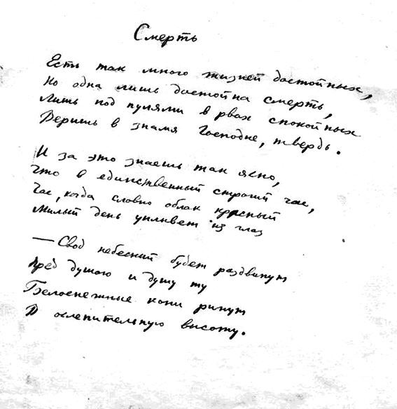 Но Николай Степанович был уверен, что делает благородное нужное дело, и делал его честно, как и все в жизни. И писал о нем честно, выдавая читателю лишь те векселя, по которым мог расплатиться лично. Поэтому он и не позволяет себе в военных стихах говорить от имени страны, народа, еще кого-то, что-то предрекать, кого-то обличать или прославлять. Он говорит за себя, рассказывает о том, что пережил, видел, прочувствовал сам. Именно поэтому военные стихи Гумилёва настолько отличаются от стихов его собратьев, всех кабинетных размышлений, восторженных или гневно-обличительных строк. И поэтому же Гумилёв не писал о войне специально. Он жил на ней, работал, а при первой же возможности занимался тем, что любил более всего на свете – творчеством.