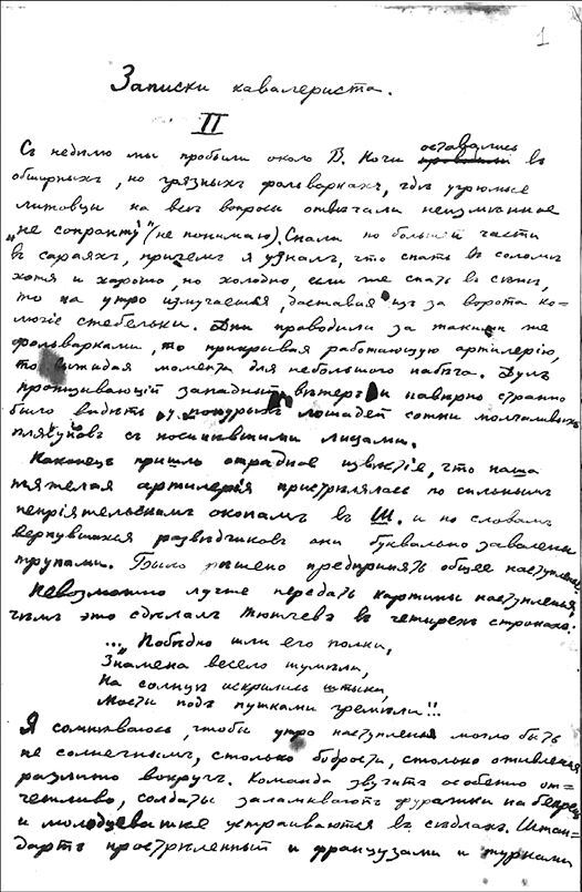 В Российском государственном архиве литературы и искусства (РГАЛИ) сохранился автограф Николая Гумилёва с другим вариантом II главы «Записок кавалериста»:
