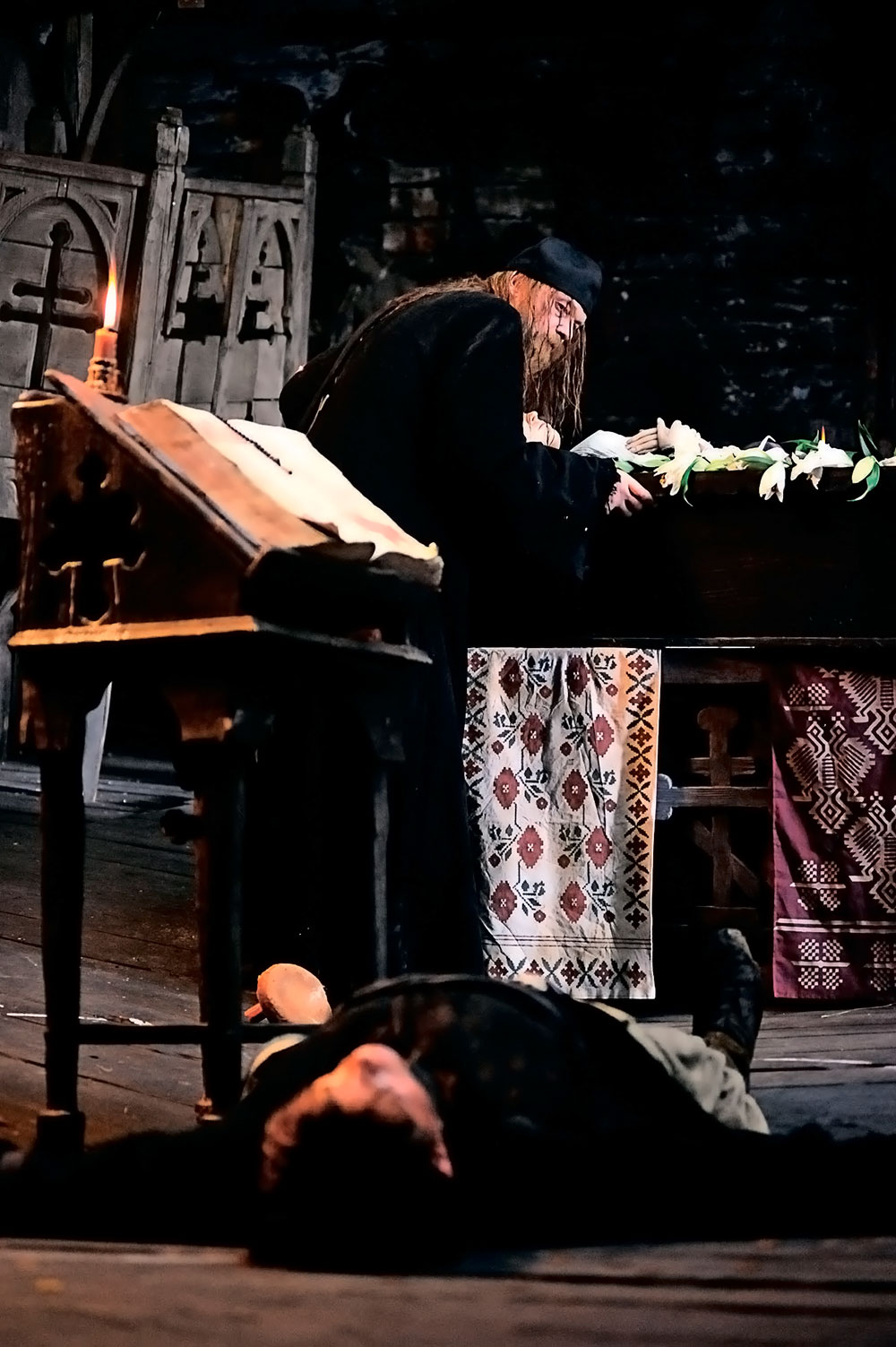 Раздался петуший крик. Это был уже второй крик; первый прослышали гномы. Испуганные духи бросились, кто как попало, в окна и двери, чтобы поскорее вылететь, но не тут-то было: так и остались они там, завязнувши в дверях и окнах. Вошедший священник остановился при виде такого посрамленья Божьей святыни и не посмел служить панихиду в таком месте.