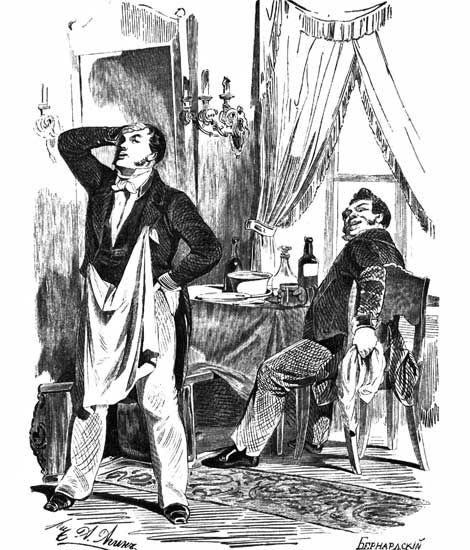 Поутру просыпался он очень поздно и, приподнявшись, долго сидел на своей кровати, протирая глаза. И так как глаза, на беду, были маленькие, то протиранье их производилось необыкновенно долго, и во всё это время у дверей стоял человек Михайло с рукомойником и полотенцем. Стоял этот бедный Михайло час, другой, отправлялся потом на кухню, потом вновь приходил, – барин всё еще протирал глаза и сидел на кровати. Наконец, подымался он с постели, умывался, надевал халат и выходил в гостиную затем, чтобы пить чай, кофий, какао и даже парное молоко, всего прихлебывая понемногу, накрошивая хлеба безжалостно и насоривая повсюду трубочной золы бессовестно. И два часа просиживал он за чаем. И этого мало, он брал еще холодную чашку и с ней подвигался к окну, обращенному на двор. У окна же происходила всякий день следующая сцена.