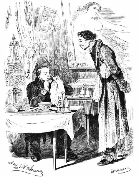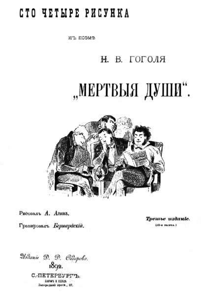 Иллюстрации к «Мертвым душам», от которых в 1846 году отказался Н. В. Гоголь, были сделаны рисовальщиком-иллюстратором Александром Алексеевичем Агиным и гравировались для печати на дереве Евстафием Бернардским. В полном виде графическая серия Агина – Бернардского увидела свет уже после смерти авторов, в 1892 году, когда Д. Д. Федоров по случаю приобрел у наследников Горяинова (он финансировал создание иллюстраций Агина с Бернардским) все доски и издал рисунки отдельным альбомом под названием – «Сто рисунков к поэме Н. В. Гоголя Мертвые души», с клише, как изданных, так и остальных отгравированных Бернардским 28 рисунков. Через полгода, в том же году вышел еще альбом под заглавием «Сто четыре рисунка к поэме Гоголя, Мертвые души. Третье издание (20-я тысяча)».