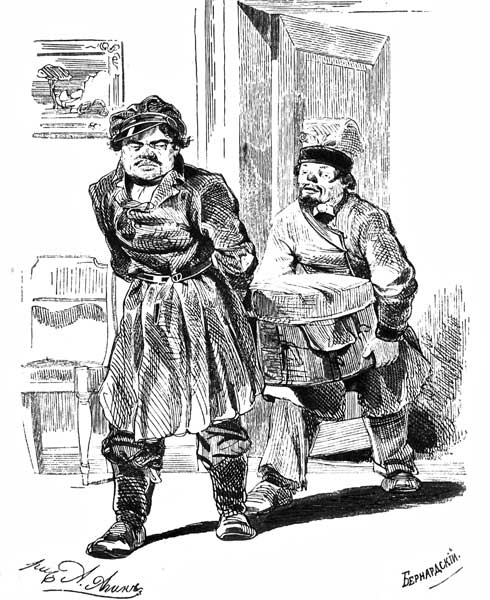 Пока приезжий господин осматривал свою комнату, внесены были его пожитки: прежде всего чемодан из белой кожи, несколько поистасканный, показывавший, что был не в первый раз в дороге. Чемодан внесли кучер Селифан, низенькой человек в тулупчике, и лакей Петрушка, малый лет тридцати, в просторном подержанном сюртуке, как видно с барского плеча, малый немного суровый на взгляд, с очень крупными губами и носом. Вслед за чемоданом внесен был небольшой ларчик красного дерева, с штучными выкладками из карельской березы, сапожные колодки и завернутая в синюю бумагу жареная курица. Когда всё это было внесено, кучер Селифан отправился на конюшню возиться около лошадей, а лакей Петрушка стал устраиваться в маленькой передней, очень темной конурке, куда уже успел притащить свою шинель и вместе с нею какой-то свой собственный запах, который был сообщен и принесенному вслед за тем мешку с разным лакейским туалетом. В этой конурке он приладил к стене узенькую трехногую кровать, накрыв ее небольшим подобием тюфяка, убитым и плоским, как блин, и, может быть, так же замаслившимся, как блин, который удалось ему вытребовать у хозяина гостиницы.