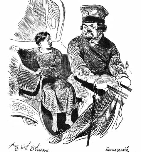 «А вот бричка, вот бричка!» вскричал Чичиков, увидев, наконец, подъезжавшую свою бричку. «Что ты, болван, так долго копался? Видно, вчерашний хмель у тебя не весь еще выветрило».