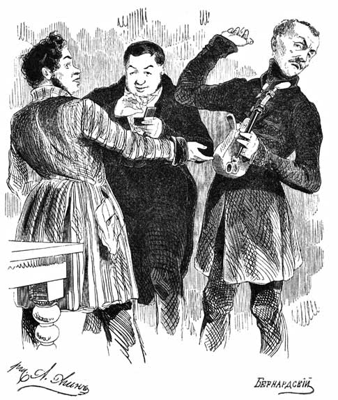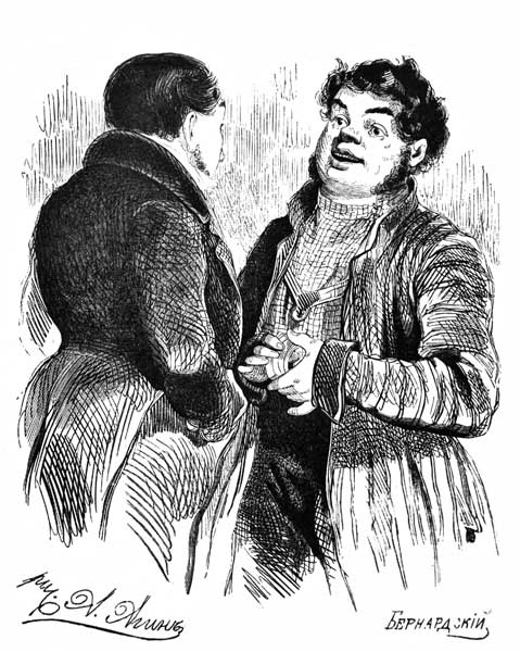 «А, хорошо, хорошо, матушка. Послушай, зятек! заплати, пожалуйста. У меня нет ни копейки в кармане».