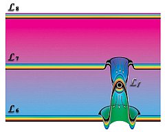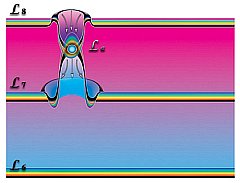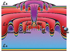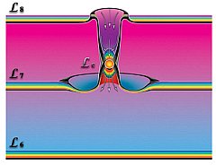 Рис. 2.5.1. Каждая звезда «живёт» миллиарды лет, после чего она «умирает». В течение этих миллиардов лет, вещество из пространства-вселенной с большей мерностью L8, через зону смыкания попадает в пространство-вселенную с меньшей мерностью L7. При этом, это вещество становится неустойчивым и распадается на первичные материи его образующие. Семь первичных материй сливаются вновь, образуя физически плотное вещeство пространства-вселенной L7. В зоне смыкания такой уровень мерности, что происходит синтез атомов тех элементов, собственный уровень мерности которых позволяет им сохранить свою устойчивость.