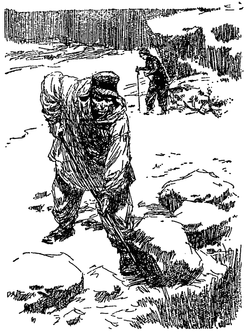 Нужно было незаметно обойти этого подозрительного незнакомца и продолжать путь на Юля-ярви. Но меня словно что-то потянуло вперёд. Затаившись среди валунов, я хорошо разглядела, что это не тот человек, который преследовал меня. На этом был смятый и грязный белый халат. В руках он держал лом и отковыривал им смёрзшиеся валуны, затем скатывал валуны в незамерзающий ручей, журчавший где-то в глубине тёмной промоины, под снегами.