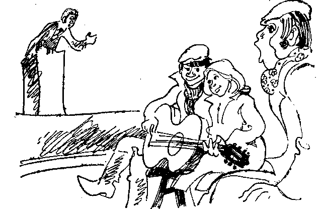 Его никто не слушал. В зале лузгали семечки, хлопали стульями, переговаривались, мяукали, в последнем ряду потихоньку играли на двух гитарах и пели хором. Только четыре солдата, приехавших на побывку, сидели по стойке смирно, положив на колени фуражки кокардами вперед.