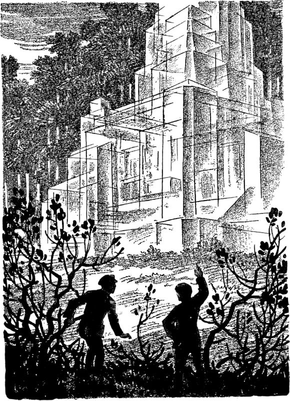 От основного корпуса здания, выдававшегося вперед и вверх безукоризненно ровным кубом, в стороны несколькими уступами спускались боковые крылья здания. Среди взбегавших столбиками и лесенками надстроек сзади высилась ступенчатая башня метров пятнадцати высотой. Я никогда не думал, что, пользуясь лишь одними прямыми линиями и прямыми углами, можно создать такие законченно-гармоничные формы здания. Оно отнюдь не было громоздким, но производило впечатление чего-то грандиозного и монолитного гораздо в большей степени, чем все многоэтажные городские дворцы, которые мне приходилось видеть. Должно быть, оно все было высечено из одного куска этого прозрачного светлого материала. Нигде и намека на спайку или на шов. Окон было мало, вероятно потому, что стены прозрачны. В одной угловой комнате я видел стол и сквозь противоположную стену – несколько расплывчатые очертания деревьев, росших сзади дома. Местами в стенах выделялись непрозрачные, нежно окрашенные полосы.