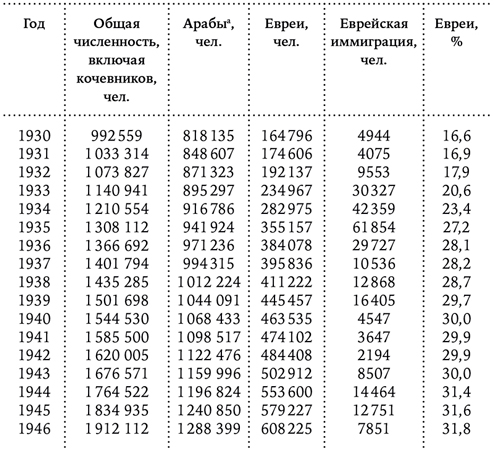 Источник: Palestine Blue Book (London: HMSO, annual); Survey of Palestine, I: 185, III: 17. Приведенные цифры относятся к зарегистрированной легальной иммиграции. Британские оценки нелегальной еврейской иммиграции составляют 30 000–40 000 до апреля 1939 г. и еще 30 000–35 000 в период с апреля 1939 г. по декабрь 1946-го.