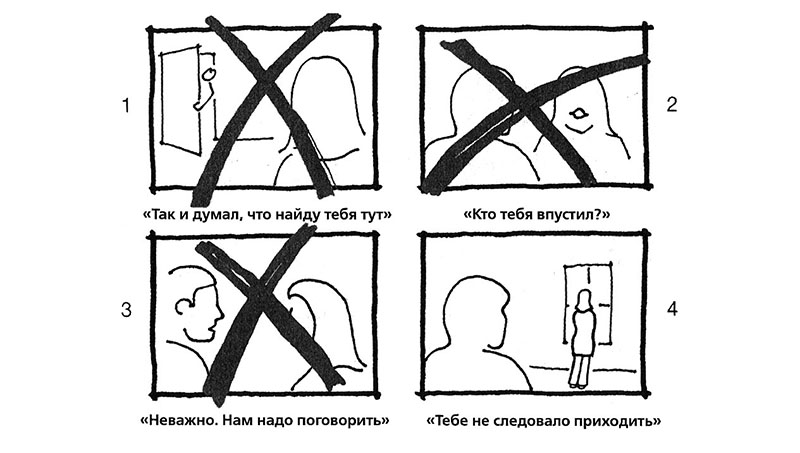 Что касается конкретных сцен, не тратьте ценное время на вхождения в комнату и приветствия. Проверьте: может, сцену лучше начать с середины? Сценарист или режиссер, если он склонен проверять самого себя, часто обнаруживает, что сцена становится только сильнее, если удалить первые две строчки диалога (а нередко – и две последние).