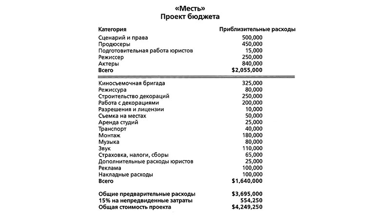 Сметные расходы – это «крупные», важные статьи затрат, которые связаны с подготовкой фильма к производству, включая покупку прав на сценарий, юридические процедуры и зарплаты режиссера, продюсера и актеров.