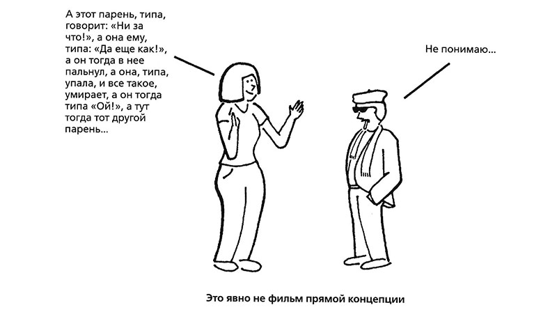 Фильм – это в первую очередь визуальное средство, так что почти все, что вам нужно донести до зрителя о сюжете и персонажах, лучше показать, а не объяснять. Визуальные выразительные средства гораздо лучше, чем прямое объяснение, покажут то, что сразу не увидишь, – глубинную психологию, невидимую предысторию и эмоциональные конфликты. Если вы показываете, вместо того чтобы рассказывать, у вас останется больше экранного времени для важных вещей.