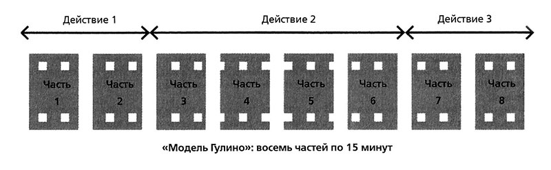 Теоретик кино Пол Гулино ратует за восьмичастную структуру фильма, которая призвана не допустить аморфности второго действия. Каждая часть длится примерно пятнадцать минут и при этом сама делится на три действия. Эта модель не обязательно должна противоречить схеме из трех действий и может накладываться на нее.