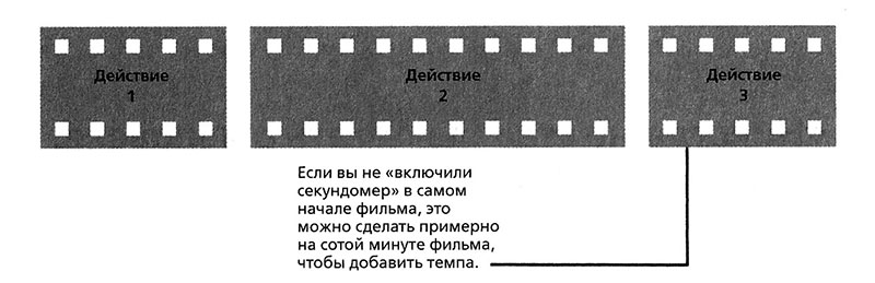 Темп – это скорость отдельной сцены. Он определяется скоростью действия, а также количеством переходов от плана к плану в рамках сцены. Быстрый темп может быть весьма увлекательным, однако если им злоупотребить, зритель утомится или перестанет ориентироваться в фильме. Медленный темп дает публике возможность во всех подробностях узнать героя и усвоить глубинный смысл вашего повествования, однако злоупотребление им может вызвать у зрителя нетерпение.