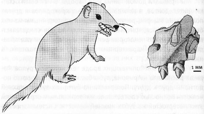 В породах возрастом около 200 миллионов лет попадаются ископаемые остатки животных, напоминающих грызунов, таких как морганукодон (Morganucodon) и эозостодон (Eozostodon). Внешне они уже очень похожи на современных млекопитающих. Размером эти животные были не больше мыши, но у них внутри заключалась немалая и важная часть нас, людей. Рисунок не позволяет передать, какие это были замечательные создания. Когда я впервые увидел этих ископаемых, я пришел в полный восторг.