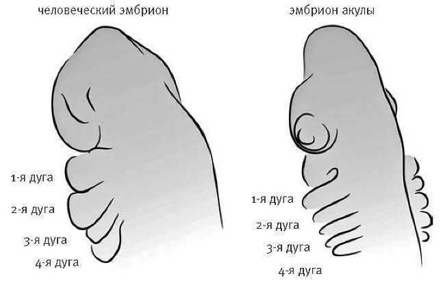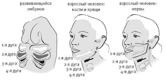 Если проследить ход преобразования дуг в процессе развития от эмбриона до взрослого человека, мы увидим, как из тканей этих дуг возникают структуры челюстей, органов слуха, гортани, горла. Кости, мышцы, нервы и сосуды всех этих структур развиваются из клеток, первоначально входивших в состав дуг эмбриона.