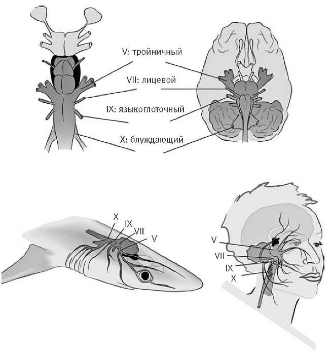 На первый взгляд кажется, что наши черепно-мозговые нервы (внизу справа) не похожи на черепно-мозговые нервы акулы (внизу слева). Но если присмотреться внимательнее, мы увидим их глубинное сходство. Все основные нервы человека есть уже у акулы. При этом соответствующие друг другу нервы акулы и человека не только обслуживают сходные структуры, но даже выходят из мозга в том же порядке.