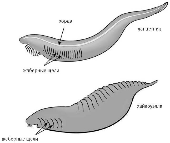 Ближайшие родственники животных, наделенных головами, – ланцетники. На рисунке показан ланцетник и реконструкция ископаемой хордовой хайкоуэллы (Haikouella), жившей около 530 миллионов лет назад. У обоих этих существ есть хорда, спинной нервный тяж и жаберные щели. Хайкоуэлла известка по трем с лишним сотням экземпляров, добытых палеонтологами на юге Китая.