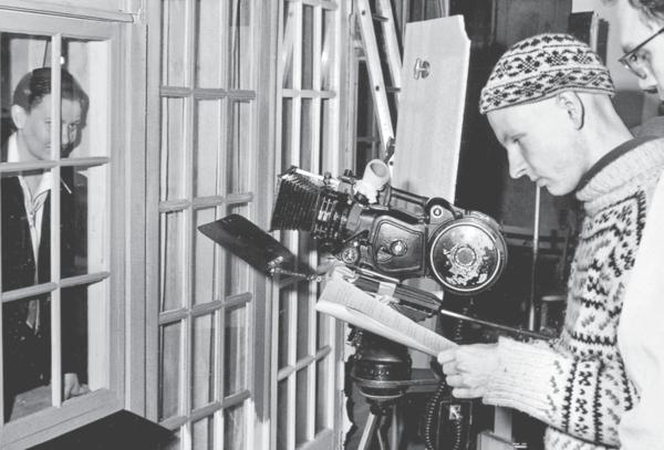 Фотография со съемок выпускного фильма Триера «Картина освобождения», на которой режиссер одет в свою любимую вязаную шапку, а за окном прячется Кирстен Олесен. То, что главным героем фильма стал немецкий солдат, не пришлось по душе ни руководству Института кинематографии, ни родственникам режиссера.