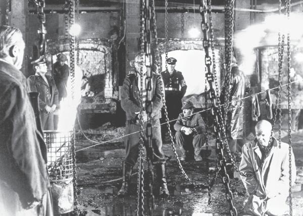 Части «Картин освобождения» снимались у старых заводских печей «Бурмейстер&Вейн» в разрушенных зданиях завода на Тегльхольмене. На этой фотографии собраны все любимые мотивы фон Триера: цепи, огонь, вода, формы СС и источники света. В правом верхнем углу объятый пламенем человек идет по канату. В правом нижнем углу виден будущий соавтор Триера, Нильс Версель.