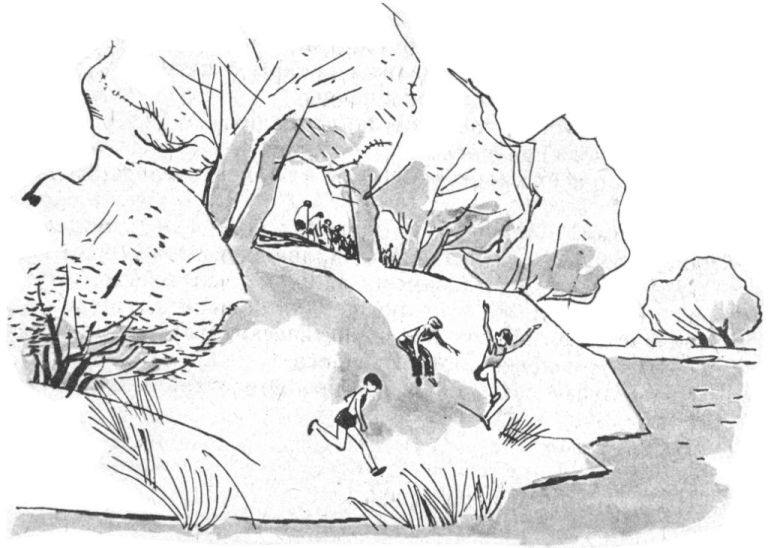 Трое мальчиков – они похожи на Гонзика – решили всё-таки выкупаться немедленно. В лесу скрыться легко: свернул с тропки, спрятался за ёлочкой – и всё. Ребята отстали от товарищей и побежали к речке.