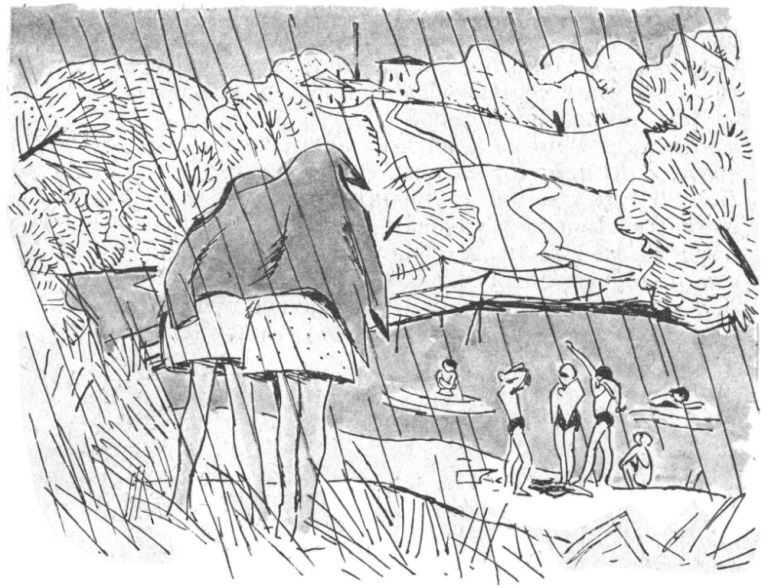 …Дождь не утихал. И всё же в лагере уже не было уныния. Колхозники пригласили туристок жить в деревне, но те отказались. Им не хотелось покидать свой лагерь. Утро, по примеру Тамары, все начинали с купания. По очереди, партиями в шесть человек – в лагере было шесть плащей, – уходили на речку и возвращались бодрые, радостные – всегда на речке происходило что-нибудь смешное.