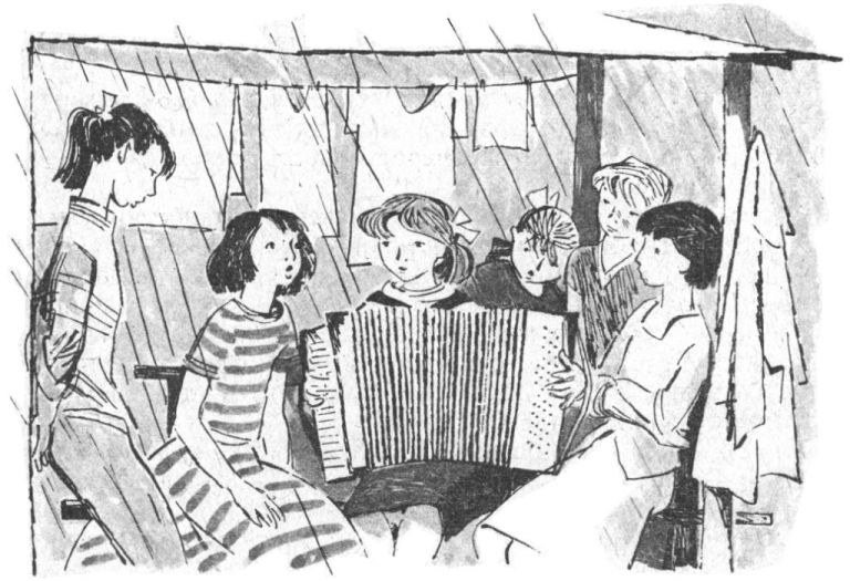 Семь дней подряд лил дождь. Представляешь себе? Каждое утро, проснувшись, девочки слышали монотонный шелест дождя. Брезентовые палатки намокли. Прикоснёшься к полотнищу, и холодная вода тотчас прольётся внутрь палатки. Огонь развести нельзя: отсырел хворост. В довершение ко всем бедам из города не пришла машина с продуктами. Видно, размыло дорогу. И маленький лагерь, в котором жило пятнадцать девочек, помрачнел.