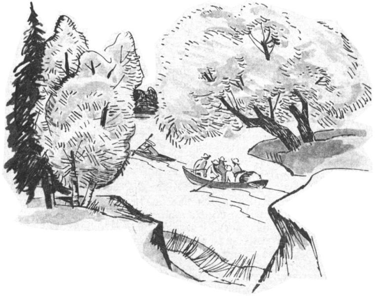 Решили так: Толя, я и Оля пойдём отыскивать место для стоянки, Вася и Слава разгрузят лодки, а Вова, Петя и Наденька разожгут костёр и сварят обед, первый обед на острове.