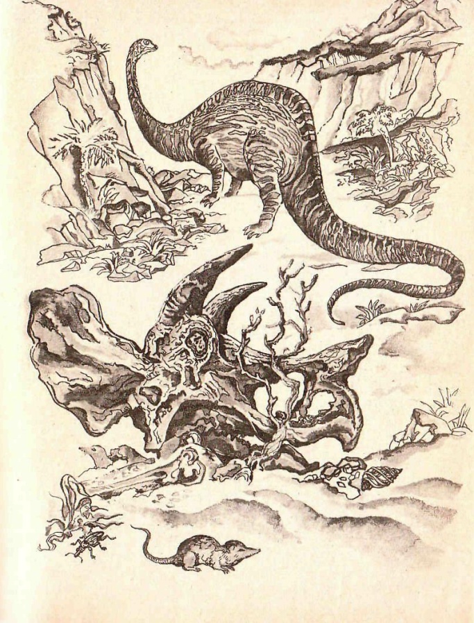 Наконец и последний динозавр покинул родные места. Дрожа от холода, брело старое чудовище по ущелью, где когда-то зеленели папоротниковые рощи. Яркая луна освещала ущелье. Старый динозавр с трудом волочил тяжелый хвост и, внезапно остановившись, злобно и жалобно заревел…
