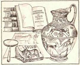 Я опять хожу в музеи, библиотеки, листаю старые книги. Рассматриваю надписи и рисунки на древних памятниках и вазах. Подолгу разглядываю глиняные черепки, найденные в первобытных становищах и пещерах.