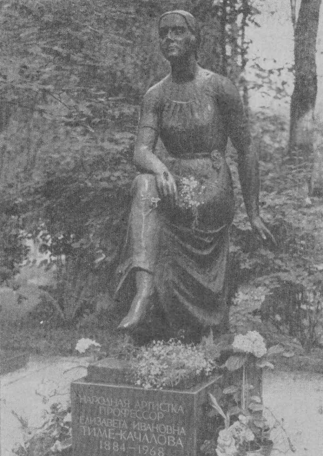 Памятник поставлен в 1963 году народной артисткой республики Е. И. Тиме (Качаловой), умершей пятью годами позже мужа и погребенной возле него. В 1969 году над ее могилой установлена бронзовая портретная статуя (работы того же скульптора). Замечательная русская актриса, Е. И. Тиме создала на советской сцене целый ряд запоминающихся образов. Среди лучших ее ролей – Маша («Живой труп» Л. Н. Толстого), баронесса Штраль («Маскарад» М. Ю. Лермонтова), Луиза («Коварство и любовь» Ф. Шиллера), Виринея (пьеса по одноименному роману Л. Н. Сейфуллиной) и многие другие. Блестящий мастер слова, она с 1928 года выступала с чтением произведений художественной прозы; с 1951 года Ё. И. Тиме – профессор кафедры актерского мастерства в Ленинградском государственном театральном институте. До конца своих дней она вела большую педагогическую работу с молодежью.