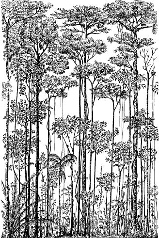 Рис. 81. Многоярусный дождевой тропический лес Центральной Амазонки. Растительность полосы длиной 20 м и шириной 5 м