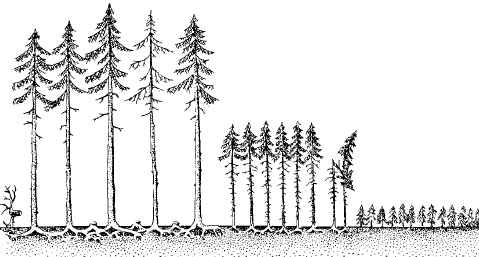Рис. 82. Одноярусный саженый еловый лес. Монокультуры разного возраста