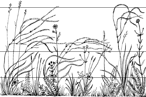 Ярусность выражена и в травянистых сообществах (лугах, степях, саваннах), но не всегда достаточно отчетливо (рис. 83). Кроме того, в них обычно выделяют меньше ярусов, чем в лесах. Впрочем, и в лесах иногда насчитываются всего два четко выраженных яруса, например в бору-беломошнике (древесный, образованный сосной, и напочвенный – из лишайников).