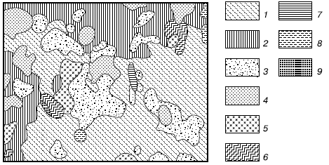 Рис. 84. Фитогенная мозаика липо-елового леса (по Н. В. Дылису, 1971). Участки: 1– елово-волосистоосоковый; 2 – елово-мшистый; 3 – густого елового подроста; 4 – елово-липовый; 5 – осинового подроста; 6 – осиново-снытевый; 7 – крупнопапоротниковый в окне; 8 – елово-щитовниковый; 9 – хвощовый в окне