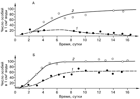 Рис. 86. Рост численности инфузорий Paramaecium caudatum (1) и P. aurelia (2) (по Г. Ф. Гаузе из Ф. Дре, 1976): А – в смешанной культуре; Б – в раздельных культурах