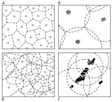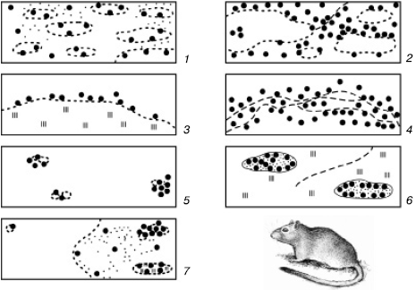 В природе изредка встречается почти равномерное упорядоченное распределение особей на занимаемой территории, например в уплотненных популяциях сидячих морских полихет, в чистых зарослях некоторых растений. Однако чаще всего члены популяции распределяются в пространстве неравномерно (рис. 104), что обусловлено двумя причинами: во-первых, неоднородностью занимаемого пространства, а во-вторых, некоторыми особенностями биологии видов, которые способствуют возникновению скоплений индивидуумов. У растений такая агрегированность возникает, например, при вегетативном размножении, при слабом распространении семян и прорастании их вблизи материнской особи; у животных – при групповом образе жизни семьями, стадами, колониями, при концентрациях для размножения, перезимовки и т. п.