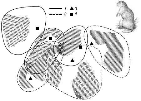 1– границы индивидуальных участков у самок; 2 – то же у самцов; 3 – гнездовые норы самцов; 4 – выводковые норы самок. Заштрихованы предпочитаемые каждым зверьком места кормежки
