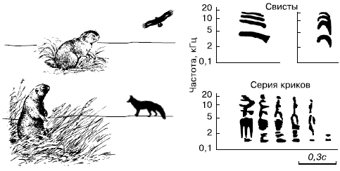 Рис. 107. Спектрограммы сигналов тревоги, издаваемых длиннохвостым арктическим сусликом. Сигналы слышны соседям (по А. И. Константинову, В. Н. Мовчану, 1985)