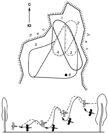Рис. 109. Поведение стрекозы-коромысла на индивидуальном участке, ограниченном лесной поляной (по В. В. Заике, 1977): вверху – охотничий участок, внизу – самец-хозяин (светлый) изгоняет самца-нарушителя (темный), стараясь прижать его к земле.