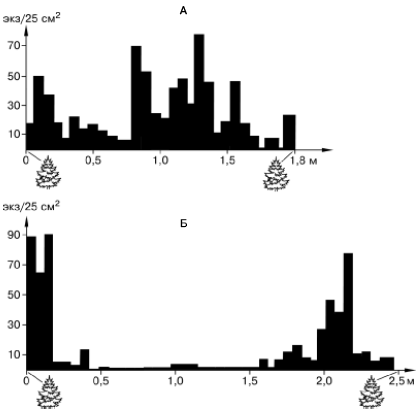 Рис. 110. Распределение панцирных клещей Nothrus silvestris в лесной подстилке между комлями двух елей в дождливый (А) и засушливый (Б) периоды. У комлей деревьев увлажнение более устойчиво