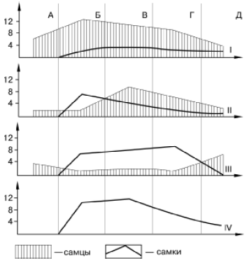 По горизонтальной оси – стадии репродуктивного цикла: А – холостой самец; Б, В, Г – время от образования пар до насиживания; Д – насиживание.