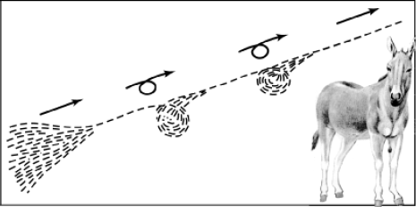 Puc. 118. Следы стада куланов, убежавших от опасности (по Л. М. Баскину, 1976). Куланы дважды останавливались и смотрели на человека